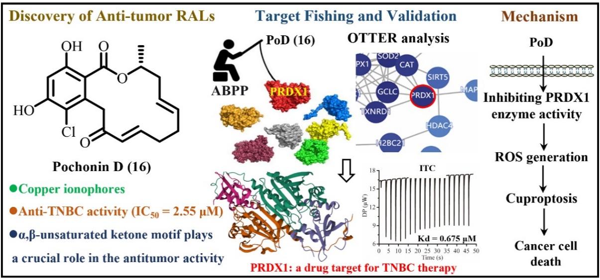 三阴性乳腺癌(TNBC)恶性程度高,缺乏有效靶向治疗,化疗疗效有限且易耐药,亟需新机制药物。本研究基于生物功能导向分离与分子网络可视化策略,从中药紫菀内生真菌中获得24个系列RALs类化合物,发现Pochonin D(PoD)为天然铜离子载体,能通过共价结合PRDX1的Cys173位点,抑制其酶活,促进胞内铜离子累积和ROS生成,诱导铜死亡以发挥抗TNBC活性。该研究首次发现PRDX1为铜死亡关键靶点,揭示其调控铜代谢与氧化应激的新机制,为TNBC提供靶向铜死亡的新型治疗策略,推动相关药物研发。相关工作以“Discovery of natural resorcylic acid lactones as novel potent copper ionophores covalently targeting PRDX1 to induce cuproptosis for triple-negative breast cancer therapy”为题发表在ACS Central Science上。beat365博士后冯力、吴体智与2022级硕士研究生郭心蕊为本文的共同第一作者,谭宁华教授、汪哲副教授、卞金磊教授为本文的共同通讯作者,beat365为唯一通讯单位。