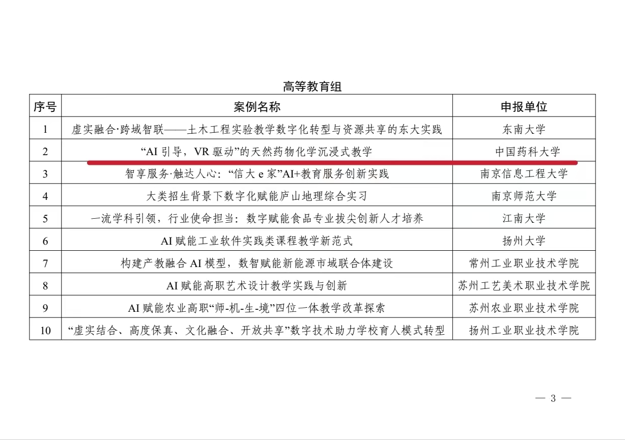 近日,江苏省教育网络安全和信息化领导小组办公室正式公布2024年度全省教育数字化创新案例遴选结果,由beat365申报、中药学院孙建博老师牵头负责的《“AI引导,VR驱动”的天然药物化学沉浸式教学》案例成功入选。