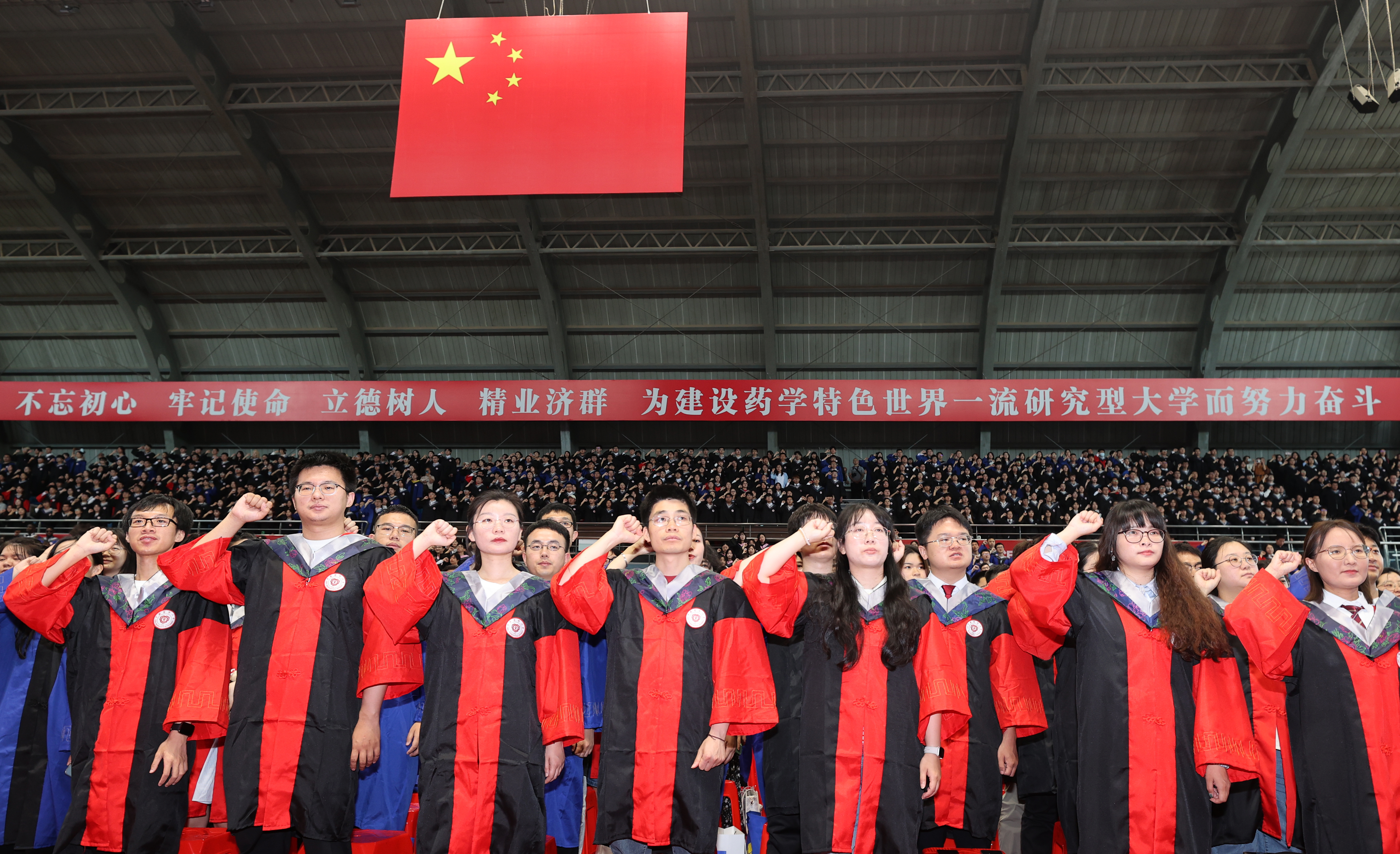 最后,在领誓人邹杰同学的带领下,全体毕业生高举右拳,重温药学生誓词,铿锵高昂的誓言在体育馆上空久久回响。