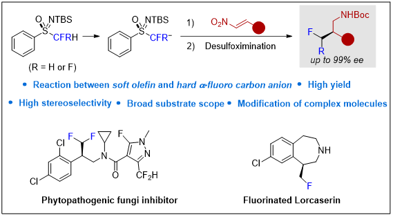 氟原子或氟烷基基团的选择性引入能够显著改变有机分子的物理和生物性质。gama-氟化胺已被证实可作为TRPC6通道抑制剂、CDK11抑制剂、植物病原真菌抑制剂及半胱氨酸蛋白酶抑制剂等,在多种疾病治疗中发挥关键作用。然而,已知方法的适用范围非常局限,通常需要多步合成。此外,ee值偏低,缺乏高效、高立体选择性的便捷方法。因此,开发一种新颖、高效且简便的策略来合成光学纯的beta-二氟甲基胺类化合物,具有迫切的需求。