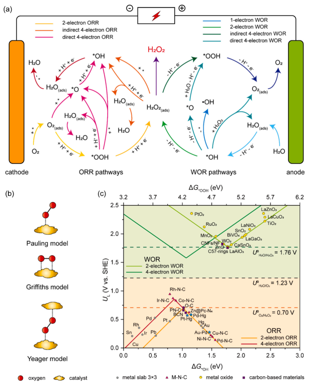 图3. 催化剂表面和中间体之间的相互作用对H2O2电生成的影响。