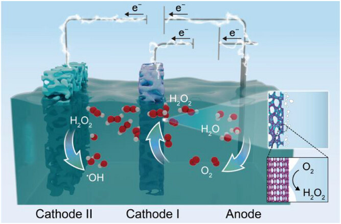 针对传统电合成H2O2方法需持续曝气这一行业痛点,本研究开发出无曝气双阴极系统,其核心是天然氧捕获电极(NOHE)。NOHE凭借超疏水微孔结构,可高效捕获阳极产生的氧气用于H2O2合成(产率达 957.1 mg gcat⁻¹),彻底无需外部曝气。同时通过将H2O2的生成与活化过程分离到独立阴极,实现两者独立优化,大幅提升效率。该系统在含盐环境中能快速去除双酚AF,矿化率达 98%,且连续运行90小时仍保持优异稳定性。这项成果通过消除高能耗曝气环节,为原位水体修复提供了可规模化、可持续的解决方案,适用于多种水生环境。
