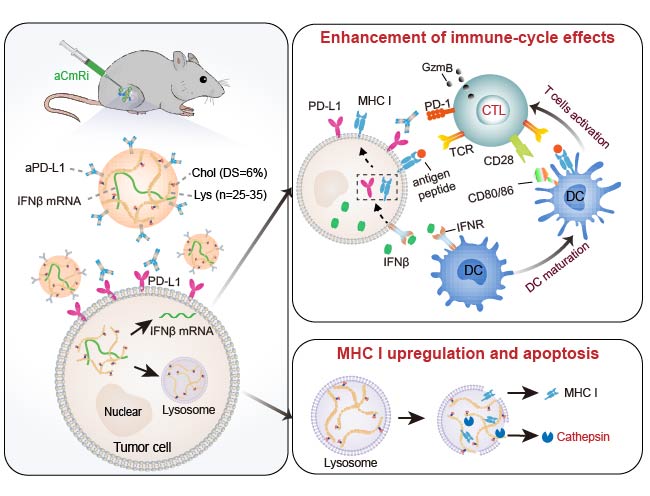 为在提升联合免疫疗效的同时最大限度地降低毒副作用,该研究构建了一种新颖、简单且通用的人工跨膜寡肽平台:以胆固醇修饰的寡聚赖氨酸(CPL)为纽带,将IFNβ mRNA与抗PD-L1单克隆抗体(aPD-L1)整合成复合物颗粒(aCmRi)。其核心优势在于CPL通过膜相互作用直接将mRNA送入胞质,绕过经典溶酶体途径,提升mRNA 转染效率;同时,CPL增强了肿瘤细胞溶酶体的通透性,促进肿瘤细胞凋亡并上调MHC I的表达;表面锚定的aPD-L1拉近了颗粒与肿瘤细胞距离,并阻断肿瘤细胞表面的PD-L1,与原位表达的IFNβ形成协同作用。该工作为解决IFNβ的非特异性靶向和体内毒副作用提供了解决方案,并为提升体内肿瘤免疫治疗的有效性、选择性和安全性,提供了一种简单而通用的mRNA治疗方法。