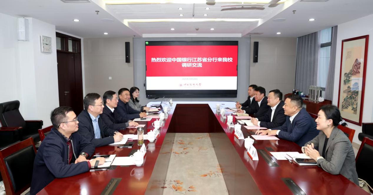 戴建君对刘小宇一行表示欢迎,感谢中国银行江苏省分行一直以来对学校发展的关心和支持。他指出,近年来,学校通过发布有组织科研兴药行动计划、创新人才引育模式、加强校地合作等,推进教育、科技、人才“三位一体”协同融合发展。戴建君表示,中国银行作为国有大行,实力雄厚,一是希望双方在现有良好合作基础上,进一步拓展合作的广度和深度;二是聚焦师生需求,为beat365官方网站师生提供更加便捷、高效、安全的综合性金融服务;三是深度对接医药领域创新需求,探索针对创新药研发与科技成果转化的专项金融支持方案,助力产学研融合,推动双方互利共赢、共同发展。