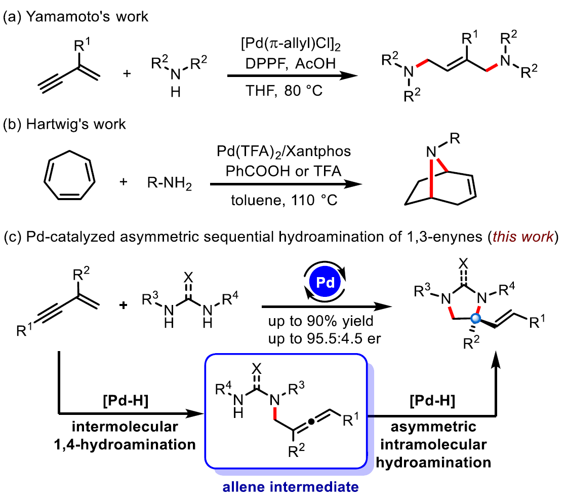 过渡金属催化不饱和键直接氢胺化可以高效构建手性含氮类化合物,具有原子经济性和步骤经济性等优点。不饱和键连续氢胺化反应,即同时构建两根碳氮(C-N)键的研究报道较少(图一,a 和b),尤其是不对称催化连续氢胺化反应至今仍没有被报道。该类反应的关键挑战在于需要确定一个高效的催化系统,可以完成两个连续但不同的氢胺化过程。此外,为了获得理想的连续氢胺化产物,催化剂需要在每个步骤中表现出较高的区域选择性、化学选择性和立体选择性。近日,姚和权/林爱俊团队针对以上问题,设计开发了一类钯催化共轭烯炔连续氢胺化反应,这一氧化还原中性策略为咪唑啉酮和噻唑啉酮等骨架的制备提供了高效合成途径(图一,c)。此外,课题组还成功实现了该类反应的不对称催化合成,构建了一系列手性咪唑啉酮类化合物。作者对反应过程及机理进行详细深入的探究,证实该反应首先经历钯催化分子间氢胺化过程形成联烯中间体。随后,钯催化联烯中间体分子内氢胺化,该过程遵循Curtin-Hammett原理,提供对映体富集的咪唑啉酮产物。
