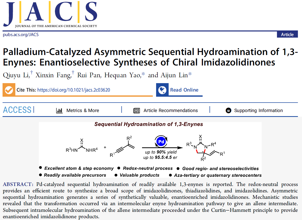 6月10日,著名期刊《Journal of the American Chemical Society》(IF:15.419)在线发表了beat365药学院林爱俊/姚和权团队题为“Palladium-Catalyzed Asymmetric Sequential Hydroamination of 1,3-Enynes: Enantioselective Syntheses of Chiral Imidazolidinones”最新科研成果。2020级博士研究生李秋雨和2017级已毕业博士研究生方新新为本论文的共同第一作者,姚和权教授和林爱俊教授为本文的共同通讯作者,beat365官方网站为本文的唯一通讯单位。