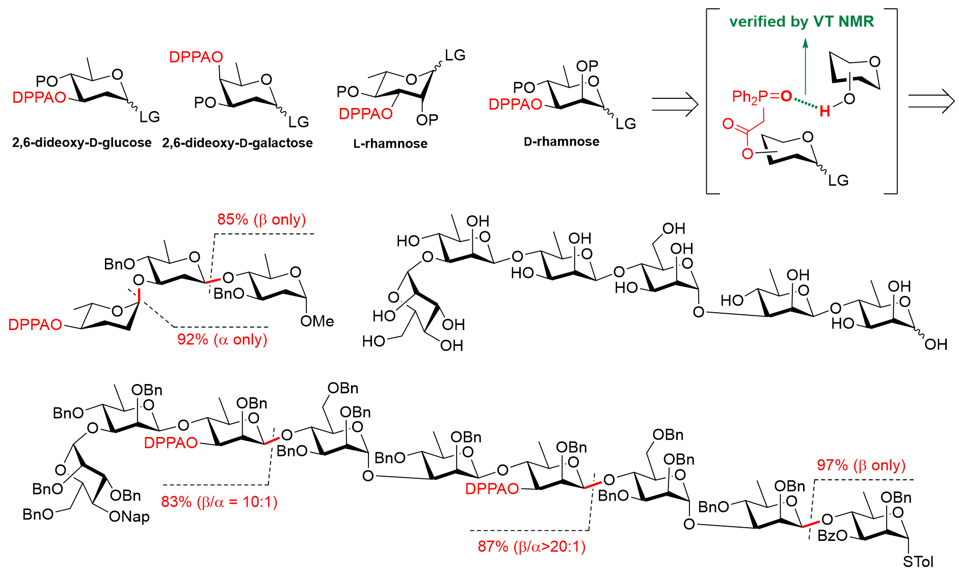 脱氧糖广泛分布于各种药物分子中。例如,强心苷地高辛和洋地黄毒苷中的2,6-二脱氧糖以及病菌抗原组分中常见的鼠李糖。但其合成和糖苷化的立体选择性控制十分困难,给相关的药物研发和生产带来极大困扰。本论文研究者在前期工作的基础上(Chin. J. Chem. 2022, 40, 443),利用原创的DPPA基团的导向效果,实现了包括蓝道霉素和Citrobacter freundii细菌O-抗原相关糖链在内的多种脱氧糖糖链的立体选择性高效合成。这一过程中的氢键介导的苷元递送途径,首次通过低温核磁在复杂体系中得到确认。该项工作能够为获取类似的复杂糖链以进行药物开发研究提供新方法和新策略。