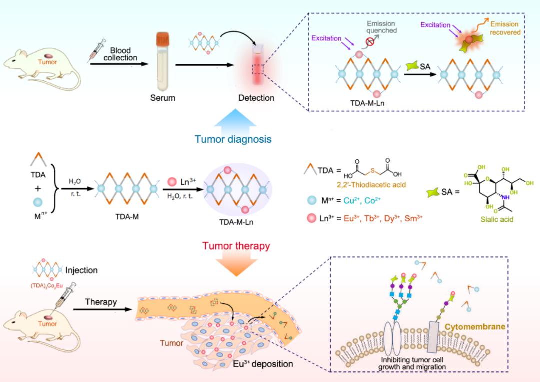 肿瘤细胞膜表面标志物的识别与检测对于肿瘤疾病的诊断与治疗具有重要意义。唾液酸 (Sialic acid, SA)是一类由九碳骨架组成的带负电荷的酸性多糖,通常结合在细胞膜糖蛋白或糖脂的链终端,参与细胞的识别、粘附、信息传递、分裂、分化等多种生命活动。大量研究表明,当机体发生各种炎症性疾病或恶性癌变时,炎症部位或肿瘤部位的细胞膜上SA表达量明显高于正常水平,SA代谢上调也使血液SA水平升高。因此,准确、灵敏地测定唾液酸含量对肿瘤的辅助诊断具有重要意义。基于此,本论文合成了一种以荧光镧系离子 (Ln3+=Tb3+, Eu3+, Dy3+, Sm3+),金属离子猝灭剂 (M2+=Cu2+, Co2+)以及有机配体2,2’-硫代二乙酸 (TDA)相配位的荧光镧系复合物TDA-M-Lns用于SA传感。SA通过与Ln3+竞争配位,导致Ln3+的“signal-on”,从而实现TDA-M-Lns对血液样本中SA检测。在TDA-M-Lns中,TDA-Co-Eu对荷瘤小鼠血液中SA检测的敏感性最高。并且,TDA-Co-Eu可通过靶向肿瘤细胞膜表面的SA,将Eu3+沉积在肿瘤细胞表面,抑制肿瘤细胞的生长和迁移,为肿瘤疾病的治疗提供了新的思路。