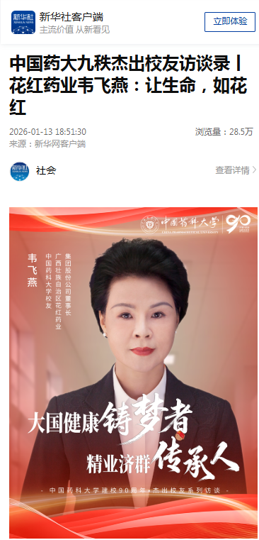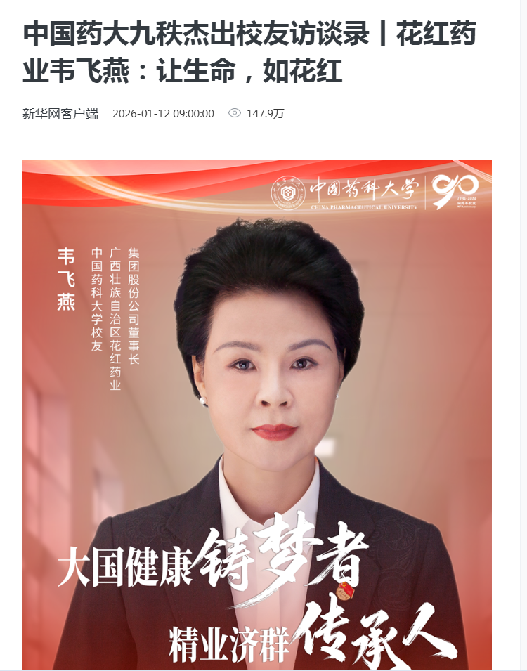 近日,新华社、新华网等中央主流媒体集中报道了花红药业集团董事长、beat365杰出校友韦飞燕女士的感人事迹与卓越成就。相关报道以“生命当如花红”为核心主题,深刻诠释了beat365学子对生命健康的敬畏、对女性群体的关怀及其对母校的深情回馈,在全网引发热烈反响。