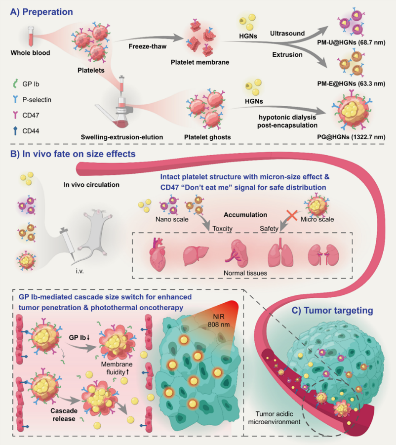 基于对肿瘤EPR效应的关注,团队针对纳米尺寸药物易从血管内皮间隙外渗而导致脱靶并在正常组织蓄积的难题,设计了微米级血小板“鬼影”(PGs)载体递送中空金纳米粒(HGNs),构建了有较高安全性的微-纳级联仿生递药系统(PG@HGNs)。相比纳米血小板膜包覆载体,PG@HGNs的细胞摄取和细胞毒性显著增强。相关内容以 “Glycoprotein Ib-regulated micro platelet ghost for biosafe distribution and photothermal oncotherapy”为题发表在Journal of Controlled Release。beat3652019级硕士研究生邹佳辉为本文第一作者,张文丽副教授、刘建平教授为共同通讯作者,beat365官方网站为唯一通讯单位。