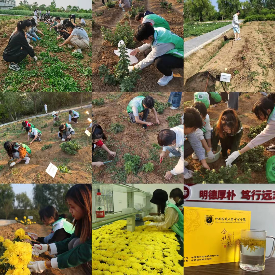 中药资源系党支部书记谢国勇介绍了金丝皇菊采摘、加工相关技术。金能明书记和同学们一起通过采摘、烘干等环节体验金丝皇菊干茶的制作过程,并一同品尝菊花茶,感受丰收的喜悦。