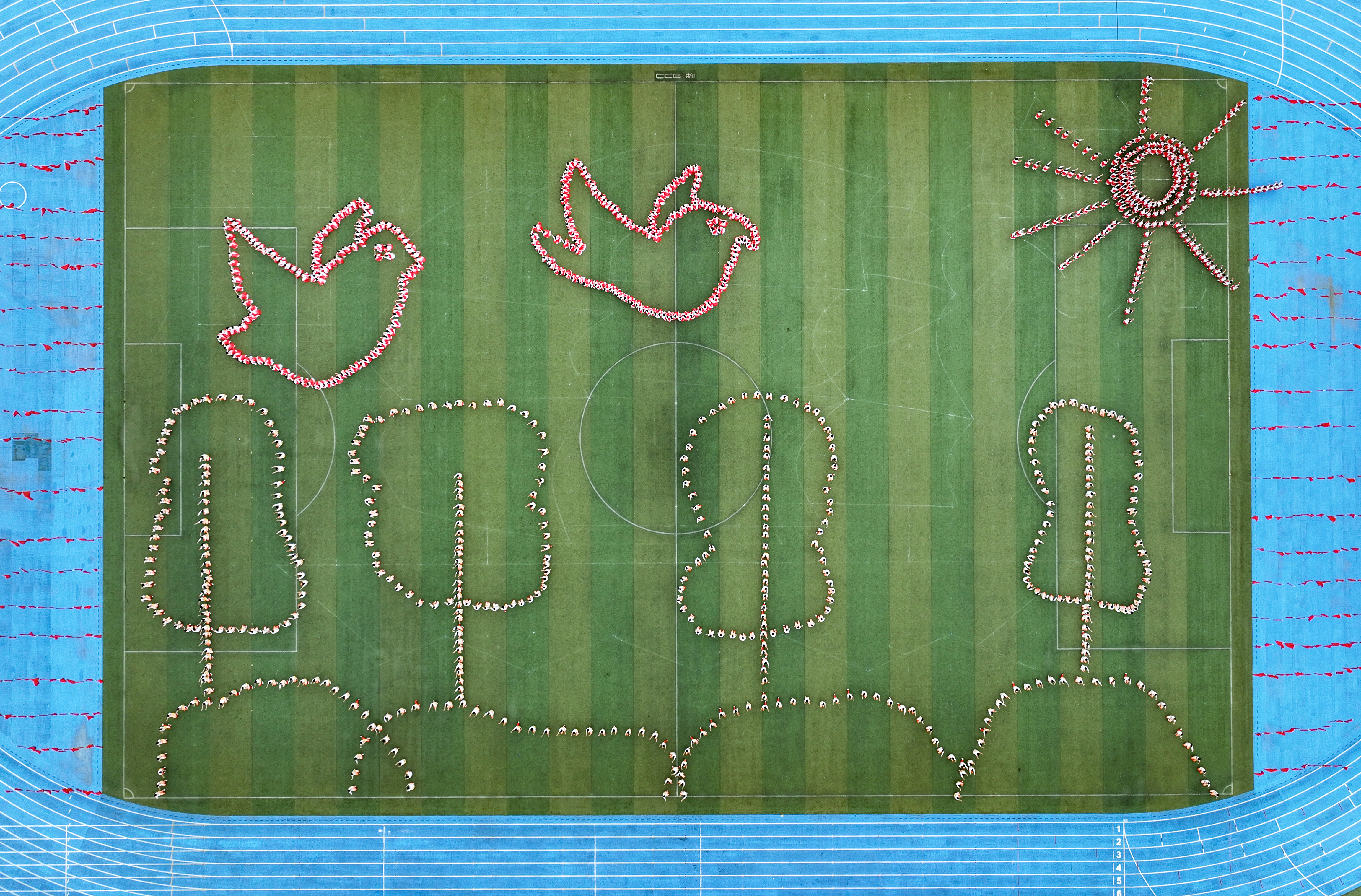 上午9点整,《我的祖国》的前奏响起,近千名身着红色长裙的beat365姑娘宛若金红的溪流,奔涌进操场绿色的汪洋中。她们二十人一组,在操场中央聚成一个个同心圆。伴随着旋律由悠扬舒缓转为慷慨激昂,踏着鼓点,两侧的beat365少年奔跑着融入红色的海洋,他们迅速切换方阵,红色波涛瞬间点亮了整个操场。随后,队伍四散,beat365姑娘们成群地化作一大一小两只“和平鸽”,在操场中央挥动着翱翔的翅膀。