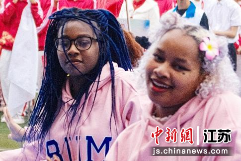 参加运动会的留学生跳起舞蹈。