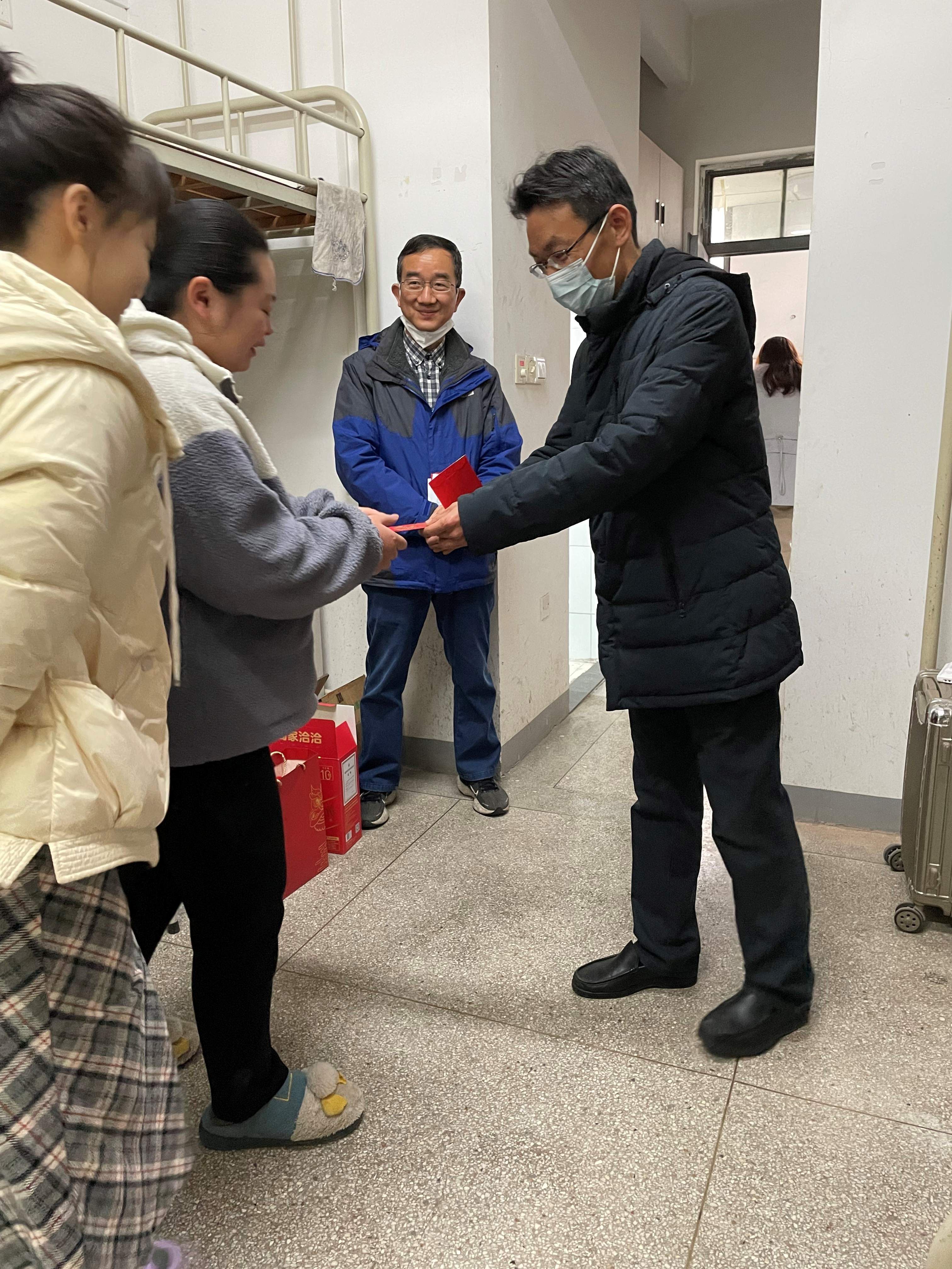 校长郝海平在学工部门负责人陪同下,走进学生宿舍,面对面和大家共话家常,亲切询问同学们寒假期间的生活学习情况。他勉励大家,作为药学生,在校期间更要当好个人健康的第一责任人。要注重科学防护,统筹规划好假期生活。留校期间,既要体验传统佳节,也要守望相助。要主动与家人多联系、与导师多沟通、与同学朋友多交流。他还为留校学生发放压岁红包,送上新年祝福,祝愿大家身体健康、学业有成、春节快乐。