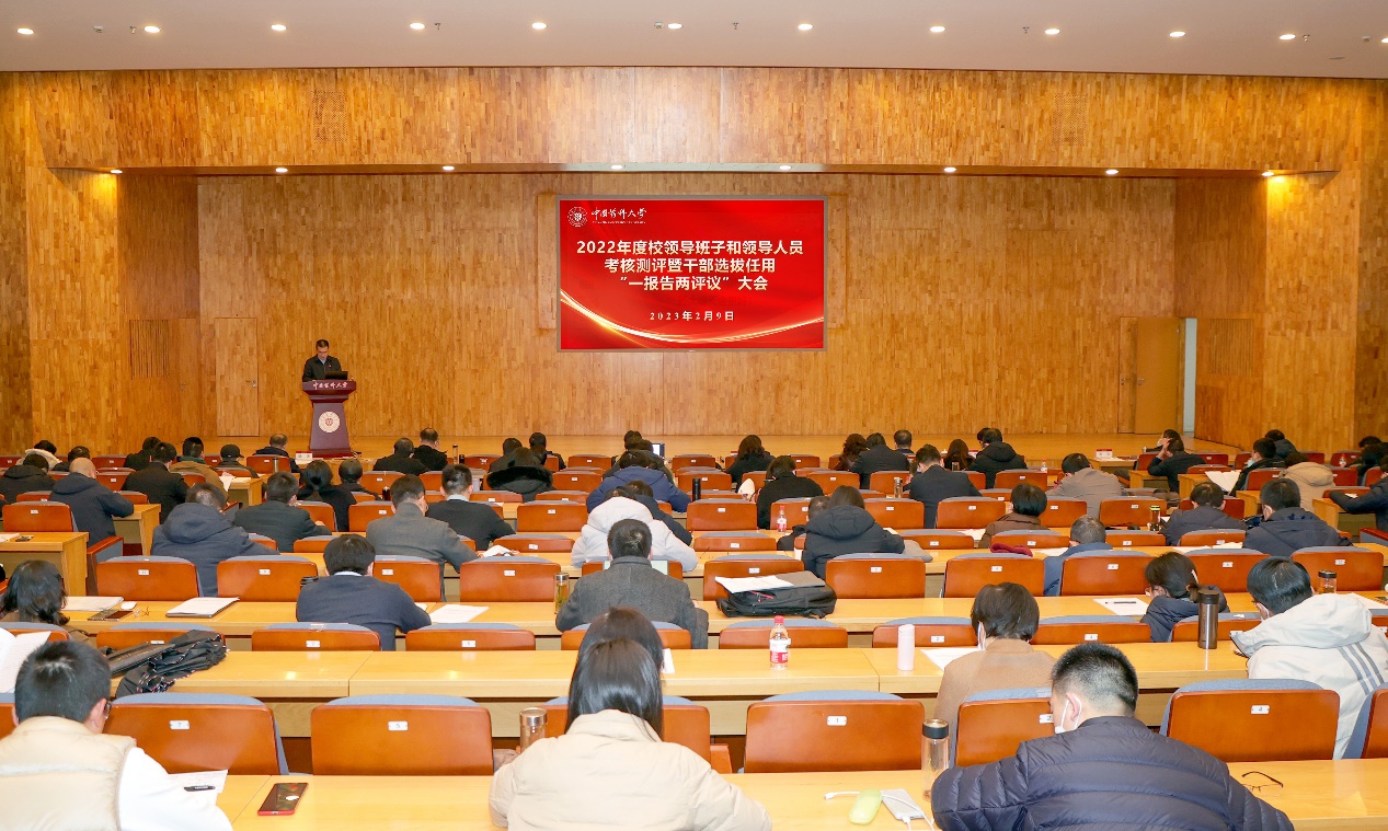 2月9日下午,beat365在江宁校区会议中心二楼报告厅召开2022年度领导班子和领导人员考核测评暨干部选拔任用“一报告两评议”大会。校领导班子成员、全体中层干部、党委委员、纪委委员、“两代表一委员”、党外人士代表、教代会代表、专任教师代表、离退休老同志代表、学生代表等130余人参加会议。会议由校党委书记金能明主持。