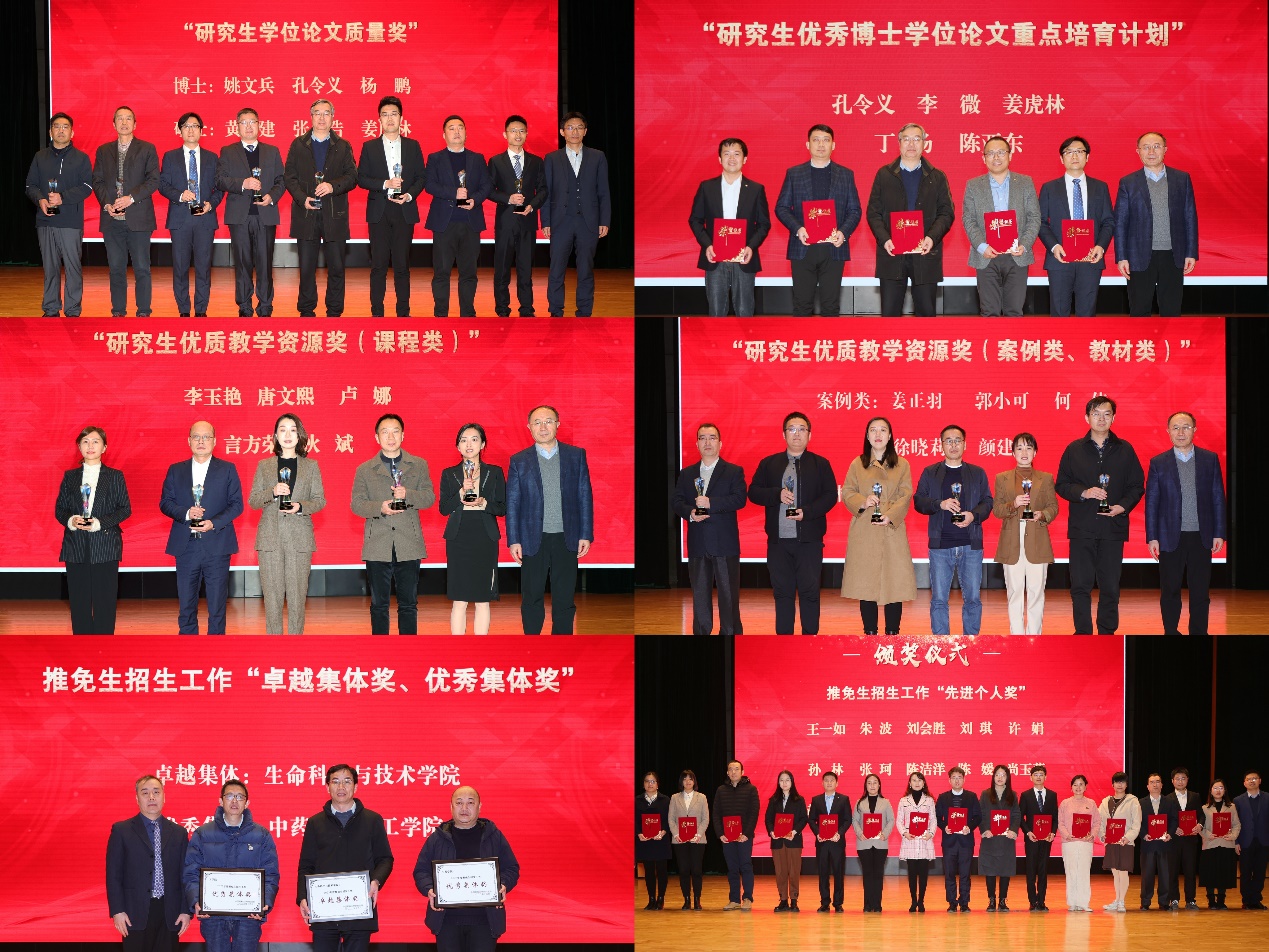 会上,校长郝海平为“2022年度研究生学位论文质量奖”获奖导师颁发奖杯;副校长陆涛为“2022年度研究生优秀博士学位论文重点培育计划”入选导师颁发荣誉证书,为“2022年度研究生优质教学资源奖”获奖导师颁发奖杯;研究生院领导为2022年度推免生招生先进集体和个人奖颁发荣誉证书。