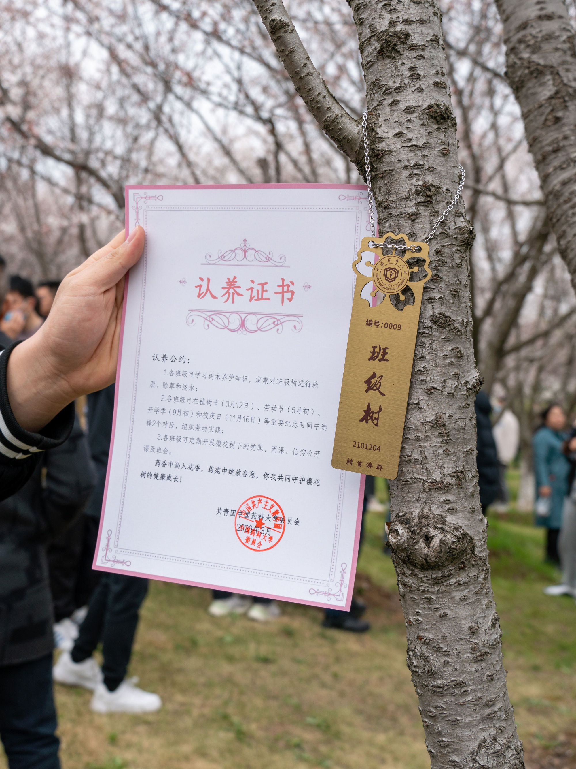 3月18日下午,学生们以班级为单位,首次开展了认养一棵樱花树的特色活动。各班级签订认养承诺书,学生们将精美标牌悬挂于各自的“班树”之上,祈愿与樱花树共同成长成才。此后,学生们负责给认养的樱花树浇水、松土、施肥,每年的植树节、劳动节、开学季和校庆日,各认养班级都可以在这里组织开展樱花树下的党课、团课、班会和劳动实践等活动。