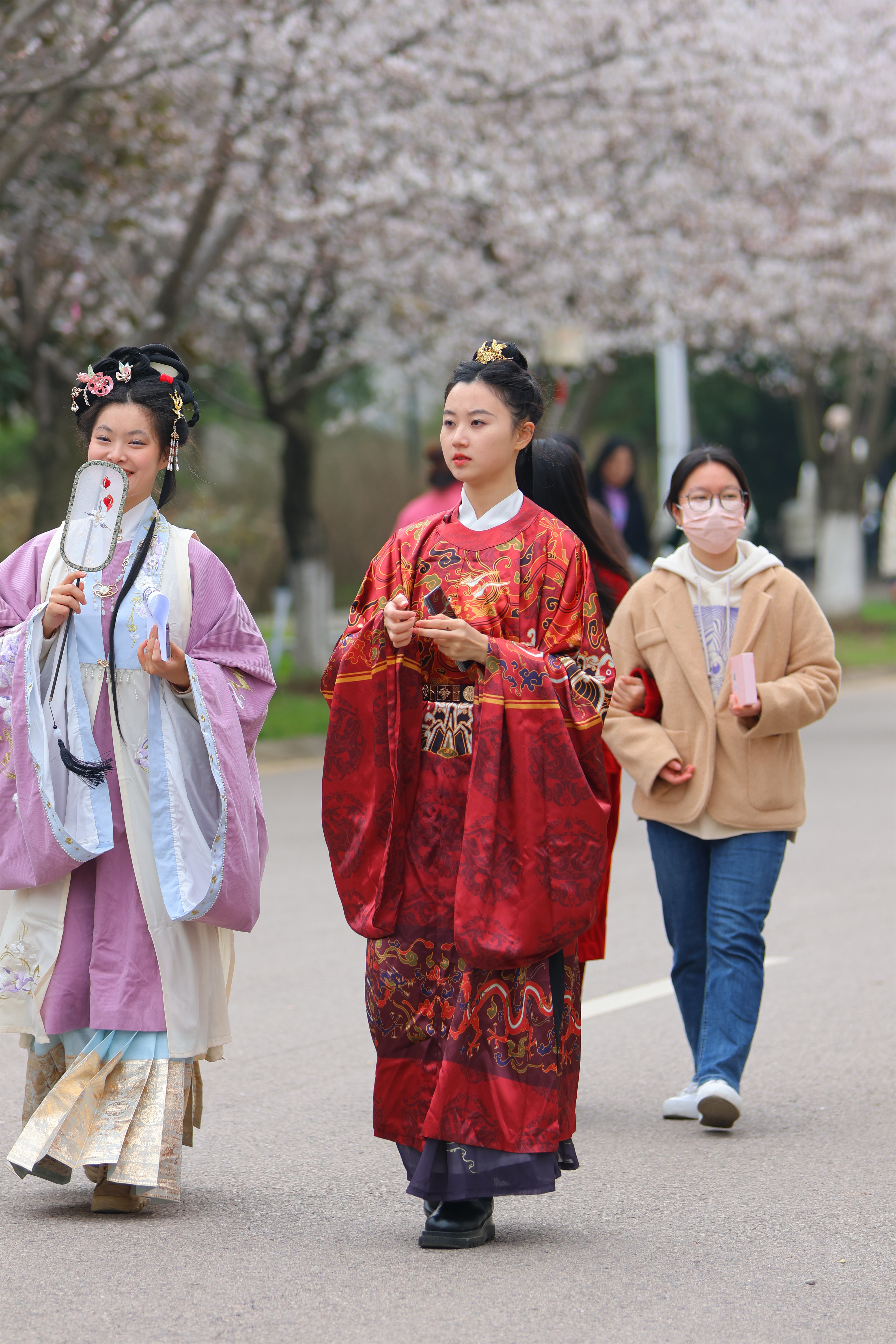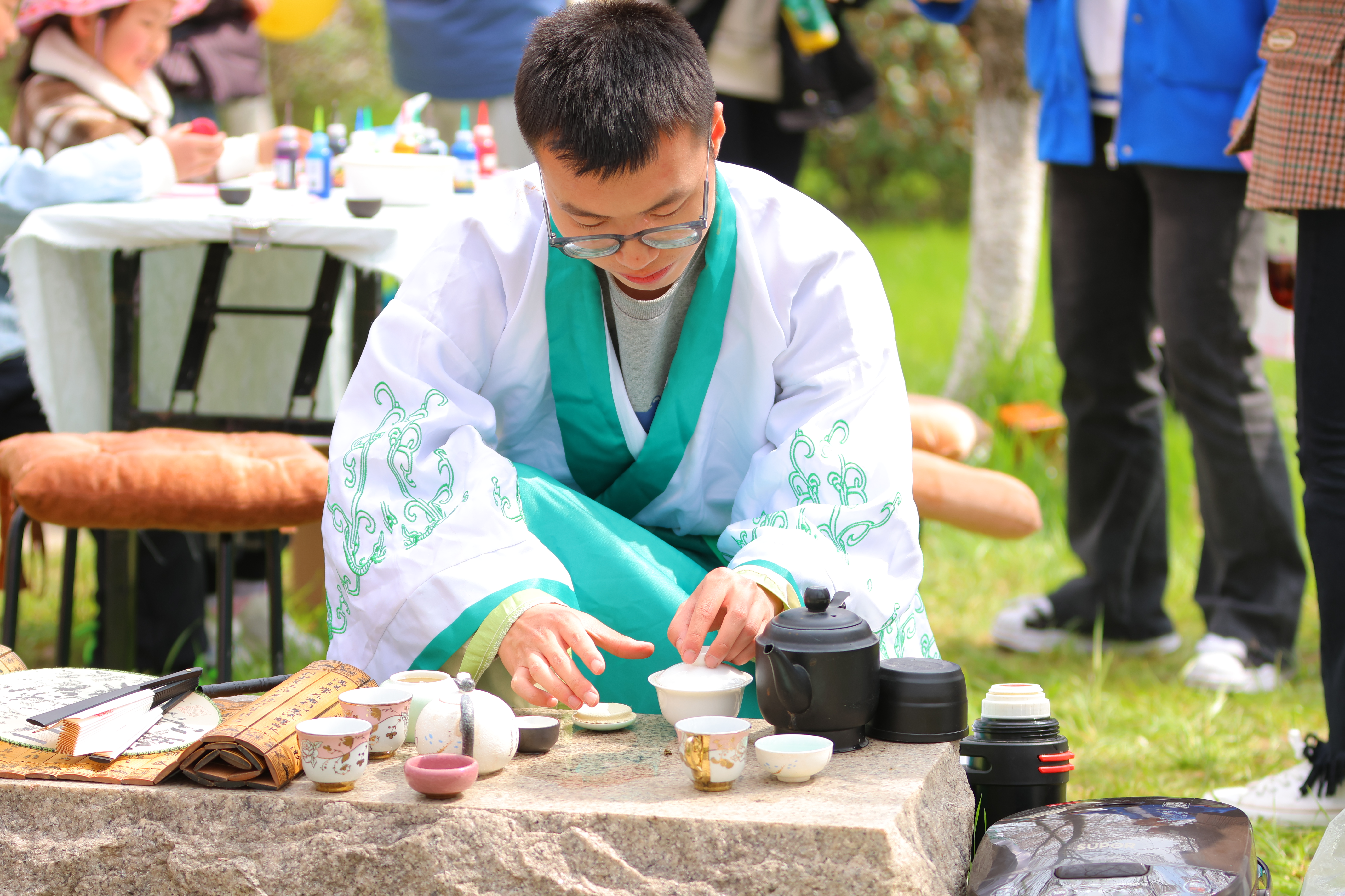 今年的樱花节氛围更浓,樱花大道两侧有着不同的热闹。樱花苑这边是各个社团的展示,清心茶社现场开起了“清心茶铺”,儒雅的古风男子不疾不徐地为大家表演茶道;沐韵流音古风社的姑娘小伙们个个汉服打扮,与樱花的浪漫完美融合;子归堂书画社摆起了书画摊子,墨香与花香交融,宣纸与樱影呼应;雕版印刷爱好者俱乐部则带来了雕版体验,同学们亲手印下作品,还可以将梦想文字书写在印刷品上,再以樱花形态的火漆封存。