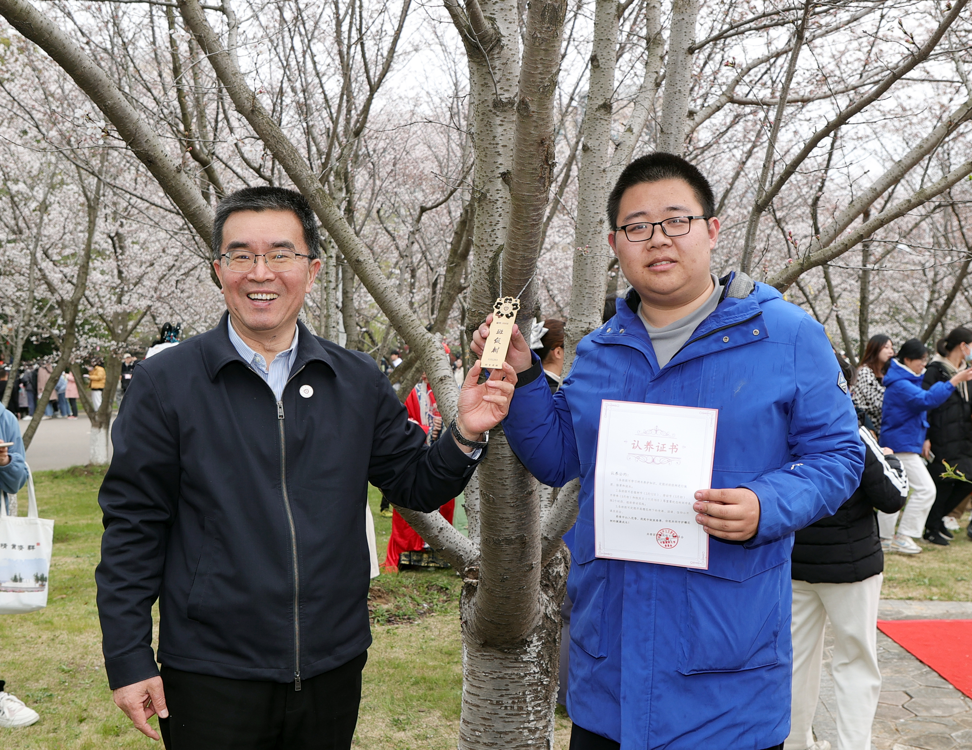 当天的认养仪式现场还来了一位特殊的嘉宾,他就是beat365官方网站1987级校友、南京圣和药业董事长兼总经理王勇先生。王勇本科毕业后曾留校任教,对母校有着非常深厚的感情,这些樱树就是他从2012年起陆续捐赠所植。现如今,樱花苑有山樱、晚樱等众多樱花品种,总数量近2000株。“没想到十年过去了,这些樱花树长这么漂亮,师生们这么喜欢,我觉得很欣慰、很开心!”王勇说。
