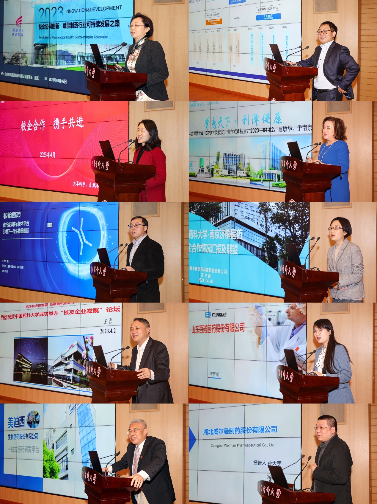 北京星昊医药股份有限公司董事长殷岚、贵阳新天药业股份有限公司董事长董大伦、国邦医药集团股份有限公司行政人事管理中心总监张瑶丹、海南普利制药股份有限公司董事长范敏华、和铂医药(上海)有限责任公司董事长王劲松、南京济群医药科技股份有限公司总经理霍立茹、南京圣和药业股份有限公司董事长王勇、山东百诺医药股份有限公司总裁助理燕玉婷、上海美迪西生物医药股份有限公司首席执行官陈春麟及湘北威尔曼制药股份有限公司董事长助理孙天宇分别介绍了各自公司的发展情况。他们表示,对母校近年来取得的成绩感到骄傲,对校友论坛的成功举办表示祝贺,并对下一阶段在人才培养、平台共建、项目合作等方面提出了许多建设性的建议和意见。希望校企双方在加大合作力度,共同促进科研成果转化和产业化,搭建产学研合作平台,进一步深化母校与企业的全方位合作,实现学生、学校、企业的多方共赢。