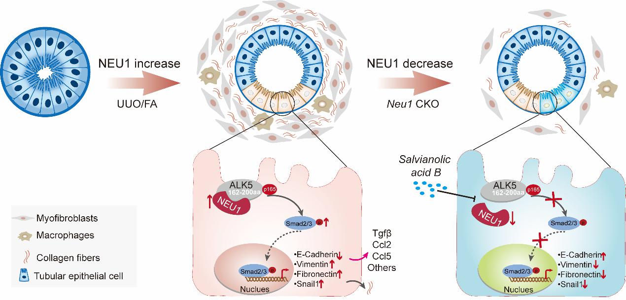 研究人员进一步以人源NEU1为靶点,从中药中筛选具有肾脏保护作用的活性成分。从近百个中药单体化合物中发现中药丹参中的丹酚酸B与人源NEU1重组蛋白具有极强亲和力(KD = 21.57 nM),是其他酚酸类成分如丹酚酸A结合能力的1000倍;通过动物水平研究,明确了丹酚酸B抑制NEU1、对抗ALK5-Smad2/3通路激活改善肾纤维化;利用NEU1敲除小鼠,证实丹酚酸B依赖于NEU1对抗肾损伤,为揭示丹参发挥肾保护作用的科学内涵提供直接靶点证据(图)。