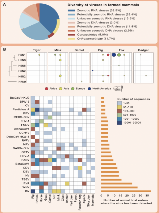 众所周知,很多人类新发传染病来源于野生/养殖动物,研究团队对NCBI上的全部病毒序列展开分析统计,发现存在超过299,000条与养殖哺乳动物相关的病毒序列,RNA病毒序列占比83.4%,已知的人畜共患RNA病毒序列占比38.5%,来自正粘病毒科的序列占比11.7%。