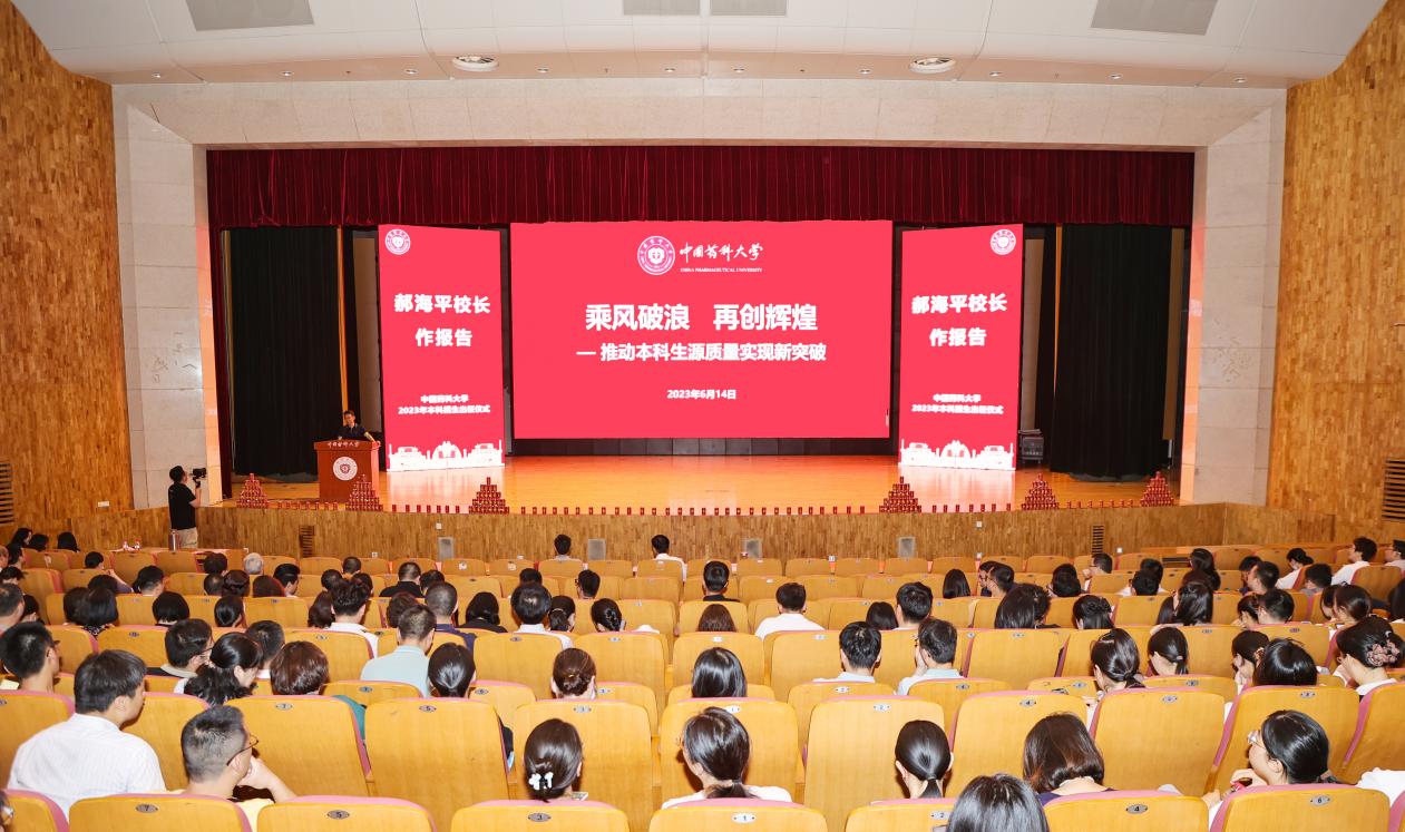 大会伊始,校长郝海平以“乘风破浪,再创辉煌——推动本科生源质量实现新突破”为主题作动员报告。他从宣传准备、专业设置、招生策略和招生目标四个方面指出了2023年驻点宣传期间的招生工作重点,进一步强调了本科生源质量对学校发展的重要性,并对各省各地区招生宣传工作作出总体部署。