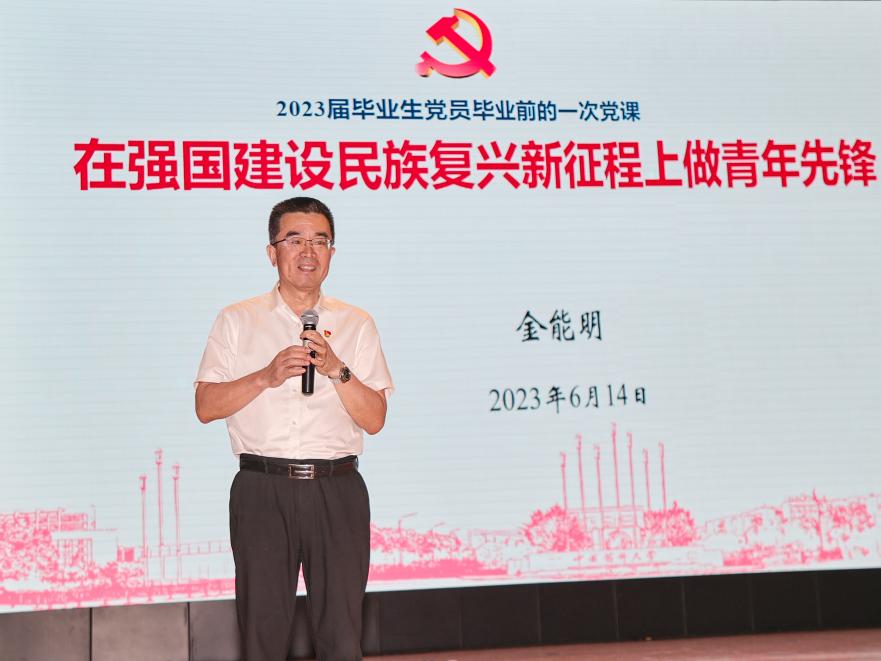 校党委书记金能明为毕业生党员作了题为“在强国建设民族复兴新征程上做青年先锋”的专题党课。他指出,要在新时代里立大志明大德。他全面梳理了十八大以来习近平总书记多次到高校考察调研、与师生交流座谈、给师生致信回信的典型案例,并以习近平总书记在正定、厦门、宁德、福州、杭州、上海等各个时期与大学生交往交流交心的暖心故事,回顾了习近平总书记对青年的殷切期望,强调要抓好后继有人这个根本大计,并指出中国青年的革命传统就是永久奋斗,勉励青年大学生要坚持永久奋斗。