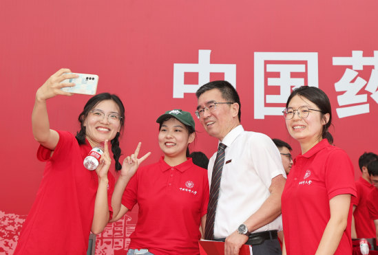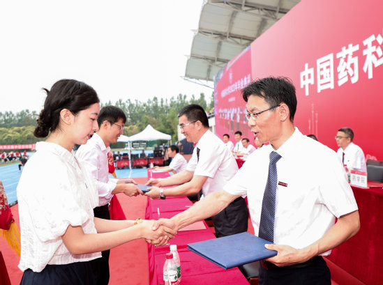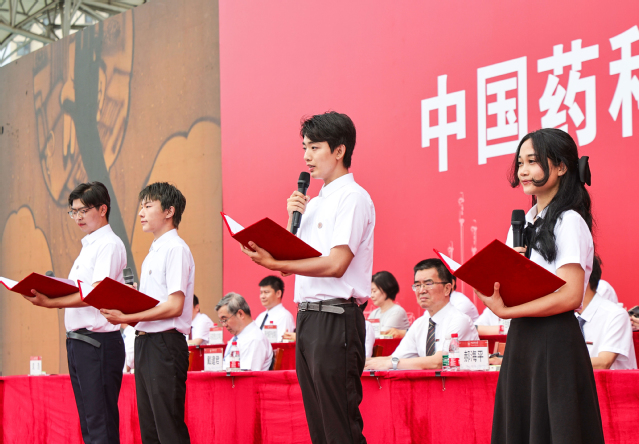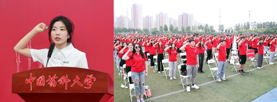 典礼上,在领誓人崔梦袁同学的带领下,全体毕业生高举右拳,重温药学生誓词,“弘扬神农伟业,建树万世之功”的铿锵之声响彻体育场上空。