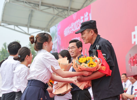 典礼上的感恩仪式温情满满、分外动人。毕业生代表向长期默默陪伴的宿管阿姨、保安大叔、食堂厨师、维修师傅,向披甲上阵抗击疫情的医护人员、辅导员、教师等代表献上感恩之花,感谢他们多年的悉心关怀、辛勤付出。