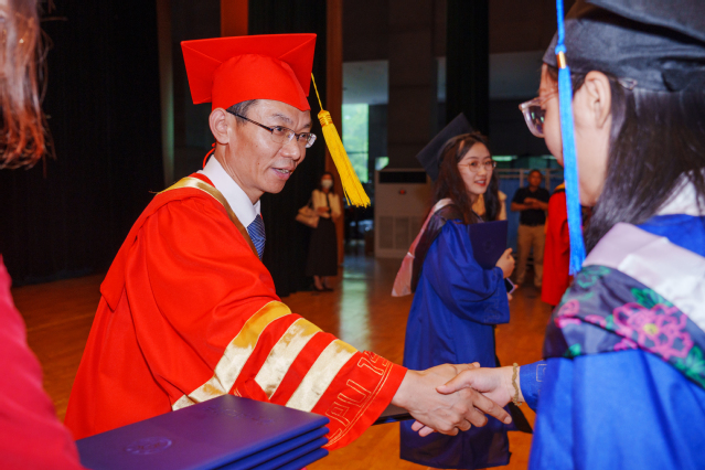 当天上午从9点半开始,在beat365官方网站大礼堂内,各学院院长先为本学院毕业生拨流苏,穿着学位服的毕业生们排着队等待校长郝海平教授亲自为其一一颁发学位证书并合影留念。