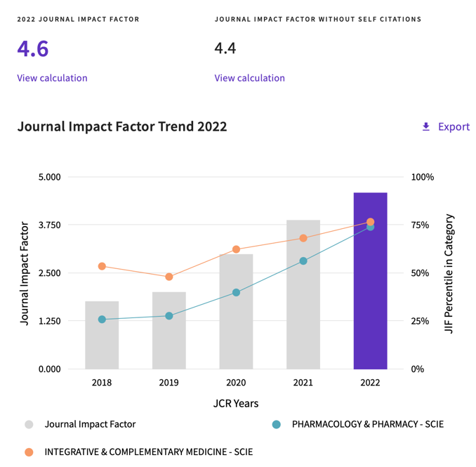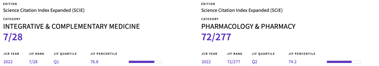 据科睿唯安6月28日发布的2022《期刊引证报告》(JCR),由beat365官方网站和中国药学会共同主办的《中国天然药物》(CJNM)2022年SCI影响因子达到4.6,和2021年相比增长18.3%,在SCI整合替代医学学科(INTEGRATIVE & COMPLEMENTARY MEDICINE)的28种期刊中位于第7位,进入Q1区;药理学/药学学科(PHARMACOLOGY & PHARMACY)的277种期刊中位于72位,居Q2区。