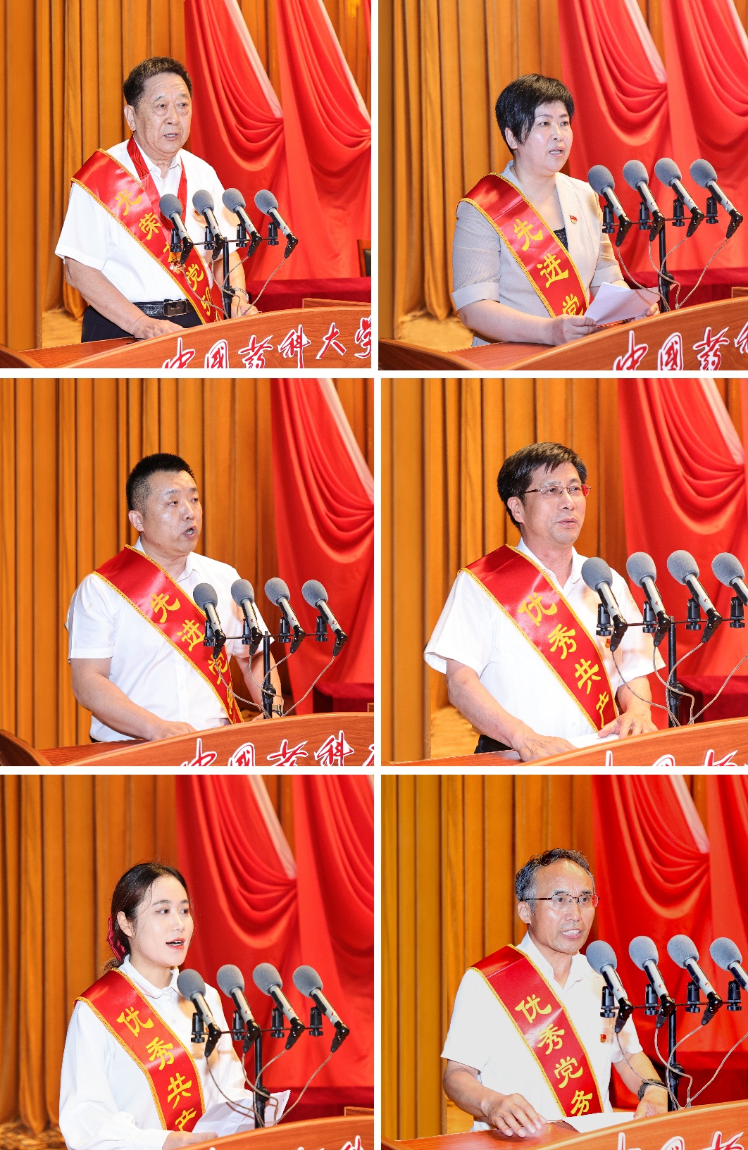 “光荣在党50年”纪念章获得者、学校关工委常务副主任、beat365原副校长李丰文,先进二级党组织代表、中药学院党委书记赵健,先进党支部代表、药学院药物化学系教工党支部书记林爱俊,优秀教师党员代表、基础医学与临床药学学院教授丁选胜,优秀学生党员代表、生命科学与技术学院2021级硕士研究生程天玥,优秀党务工作者代表、药学院药剂系教工党支部书记吴正红作为获奖代表作交流发言。
