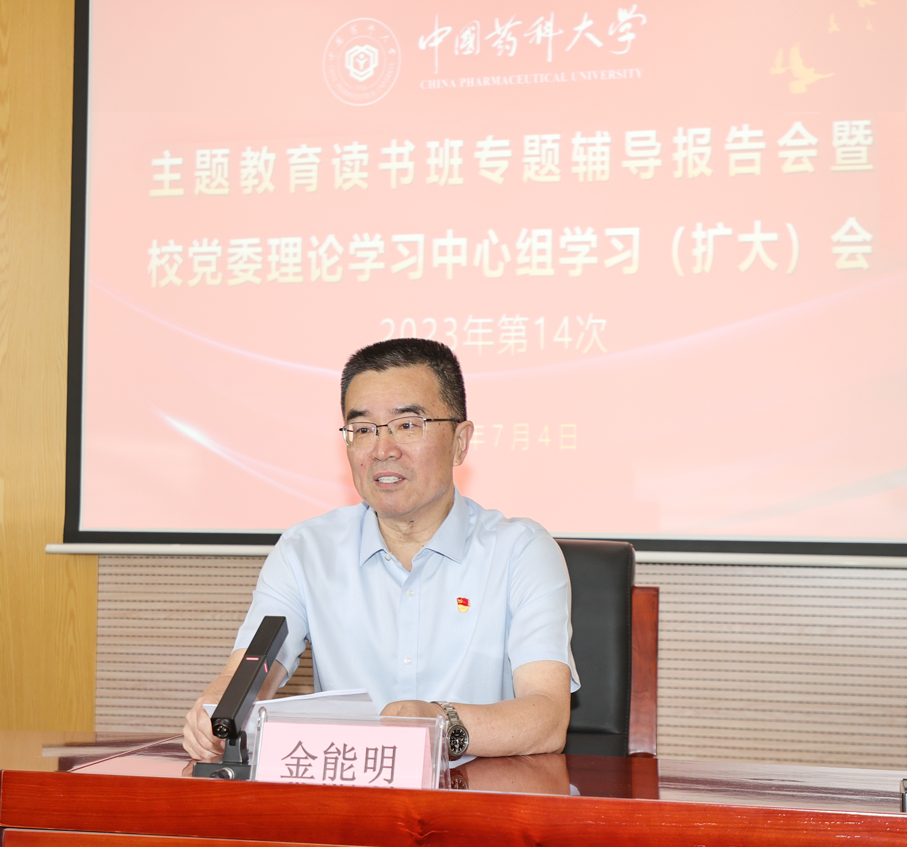为推动主题教育走深走实, 7月4日,beat365举行主题教育专题辅导报告会暨校党委理论学习中心组第14次学习(扩大)会。校领导、校党委理论学习中心组成员、部分师生代表和石家庄四药有限公司党委委员及支部书记参加报告会。会议由校党委书记金能明主持。