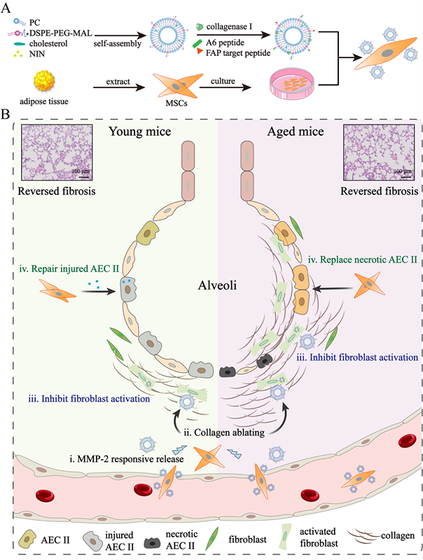 肺纤维化(PF)是一种与年龄相关的间质性肺疾病,中位生存期仅为2-4年。在疾病发生过程中,II型肺泡上皮细胞(AEC II)的持续损伤诱发成纤维细胞过度活化和细胞外基质(ECM)过度积累。姜虎林教授团队前期制备双药负载的聚合物胶束(PER NPs)黏附在单核细胞衍生的多能细胞(MOMC)上形成MOMC/PER,在年轻小鼠中表现出优异的抗纤维化疗效,相关成果发表于Sci Adv(2020,6:eaba3167)。随着研究的深入,针对受损的实质细胞,利用再生能力更佳、安全性良好的间充质干细胞(MSCs)构建MSCs杂化球体以增强组织的再生,相关成果发表于Sci Adv(2022,8:eabn8614)。然而,PF是一种典型的年龄相关疾病,中位诊断年龄为66岁,由于广泛坏死的AEC II和纤维化肺内致密的ECM沉积,老年患者的纤维化难以治愈。针对该问题,姜虎林教授团队构建一种基于MSCs的纳米工程平台(MSCs-Lip@NCAF),通过生物黏附的方式将MSCs与装载尼达尼布的I型胶原酶修饰脂质体进行偶联来治疗严重纤维化。