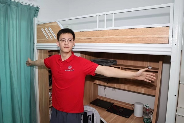 刚刚入学,来自国际医药商学院的江西新生,原思秋就收获了自己的第一个“高定”,这份“高定”其实是一张特殊的加长床位。刚刚18岁的他,身高就达到了2.01米。