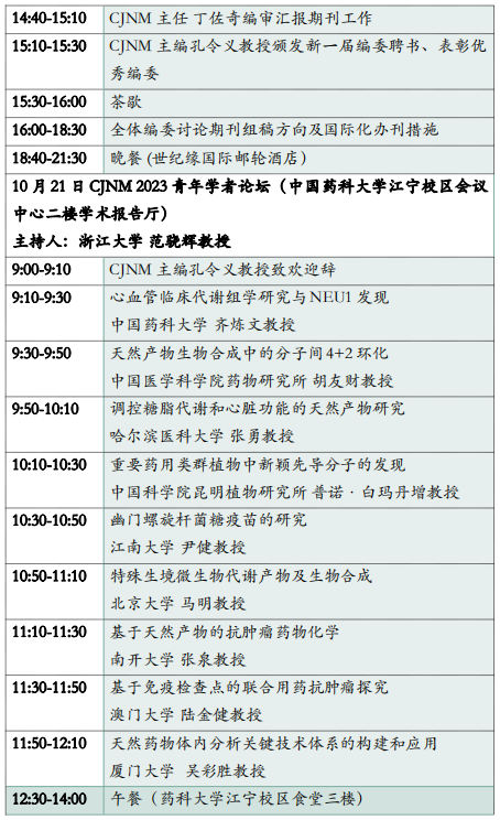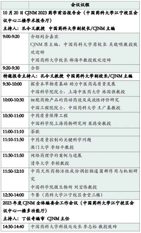 2023年10月19-21日,CJNM期刊将在beat365官方网站江宁校区召开2023年度CJNM全体编委会工作会议暨药学前沿报告会。届时将邀请天然药物领域的院士、杰青、知名专家围绕天然药物前沿热点作精彩报告。会议主题为“聚焦天然药物前沿热点,推动学科交叉融合”,热烈欢迎广大读者作者参会。本次会议不收取会务费。会议同期召开2023年度CJNM编委会全体工作会议,诚挚邀请编委会全体委员参加会议。
