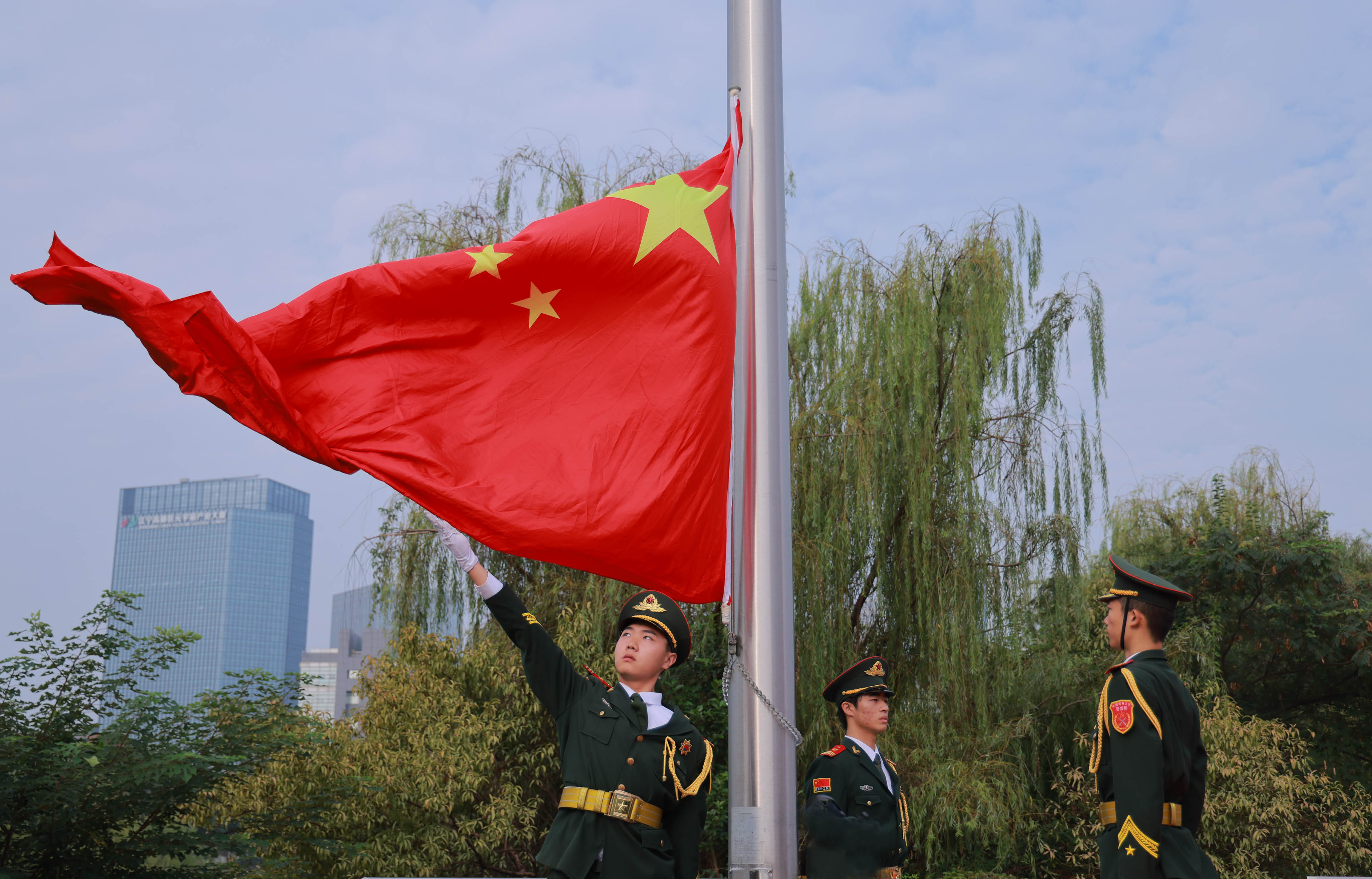 早上8时,校国旗护卫队迎着朝阳,迈着铿锵有力的步伐入场,在雄壮的国歌声中,五星红旗冉冉升起,全体师生高唱国歌,向国旗行注目礼。