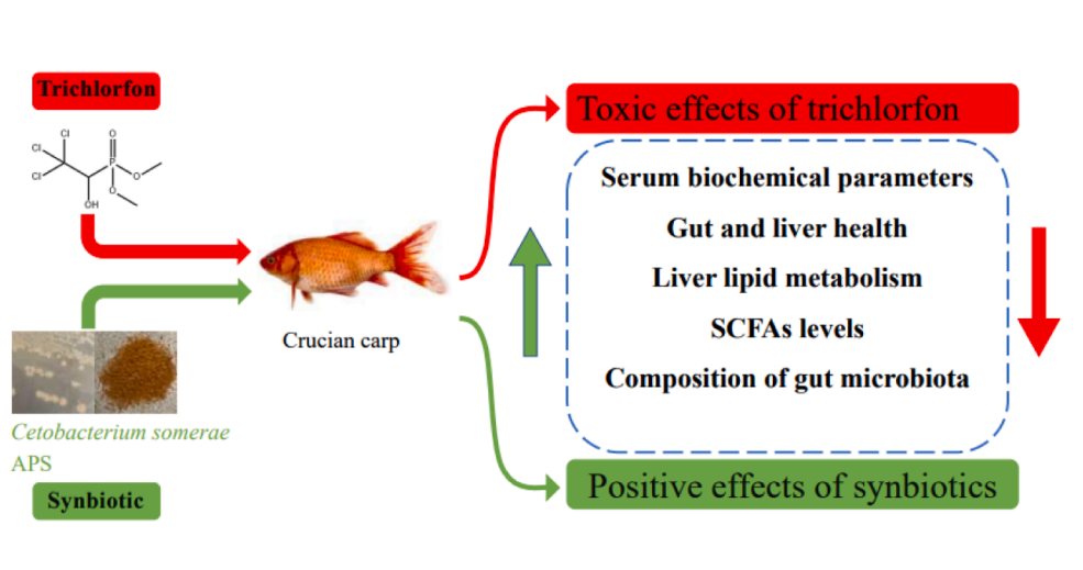 敌百虫是一种高效的有机磷杀虫剂,在水产养殖中被广泛使用。由于在水产养殖和农业中过度使用,鱼、蟹和虾类在水中特别容易受到敌百虫的影响。鲸杆菌属(Cetobacterium)作为一种共生菌,普遍存在于多种鱼类的肠道中,具有调节肠道菌群组成、改善肝脏健康的能力。黄芪多糖(APS)是从应用广泛的中草药黄芪中提取的一种天然大分子物质,已经证明了其对鱼类的保护作用。该研究以肝-肠轴为基础,以鲫鱼为模型,通过肠道菌群16S测序、SCFA检测和生理生化检测等手段,发现敌百虫对鲫鱼具有肝毒性,而由鲸杆菌和黄芪多糖构成的合生元则能调节肠道菌群,促进有益菌的生长,增加短链脂肪酸的产生,减轻敌百虫所致的肝损伤。