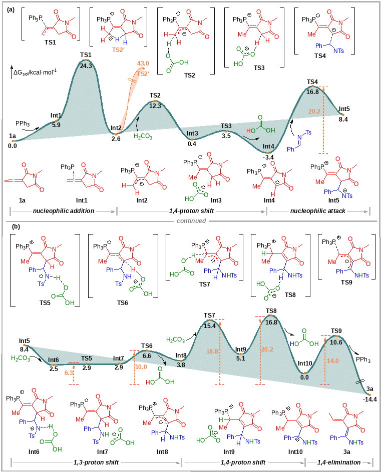 膦催化反应在构建碳-碳/碳-杂原子键中已得到蓬勃发展,其中亲核有机膦催化联烯与亚胺的环化及环加成反应已经逐渐发展成为构建碳环和杂环化合物以及天然产物的重要工具之一。衣康酰胺是多种天然产物、生物活性分子和光学材料中的骨架结构。周庆发课题组通过发展膦催化的非环化反应,在温和的条件下实现了衣康酰胺衍生物的高效、高立体选择性构建。该反应不同于联烯与亚胺的经典环化反应模式,反应经历了两性离子中间体与芳基亚胺的非环化反应模式,作者对反应机理进行了深入研究,通过一系列控制实验并结合DFT理论计算表明碳酸在该反应模式中起关键作用。
