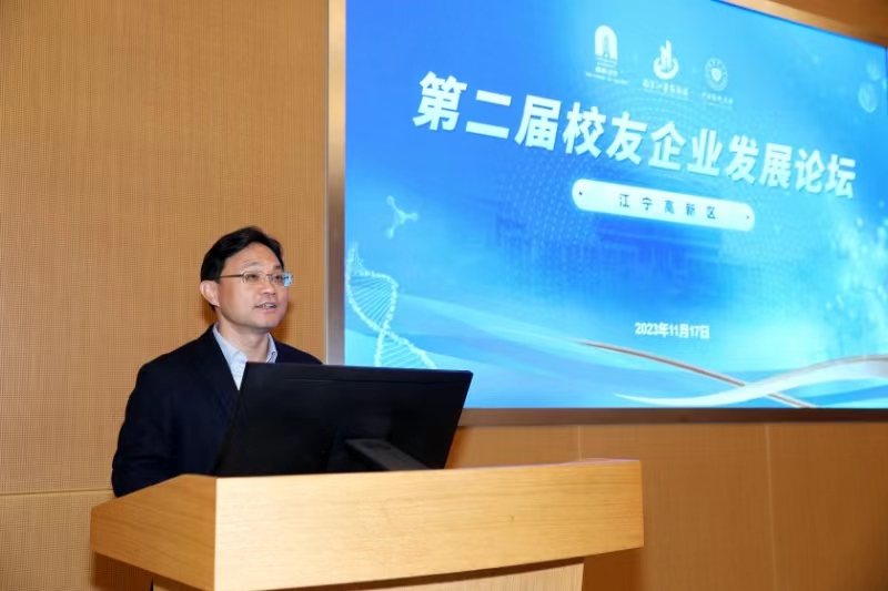 江宁区人民政府副区长、党组成员、江宁高新区党工委书记王才权对江宁高新区生物医药产业布局及政策导向作了详尽介绍。他表示,江宁高新区将以创新集聚促进产业发展,以成果转化推动企业转型,以“校友经济”助推产业落地,打造高校、企业、校友、园区深度融合、相互哺育共同发展的“校友经济”发展新模式。