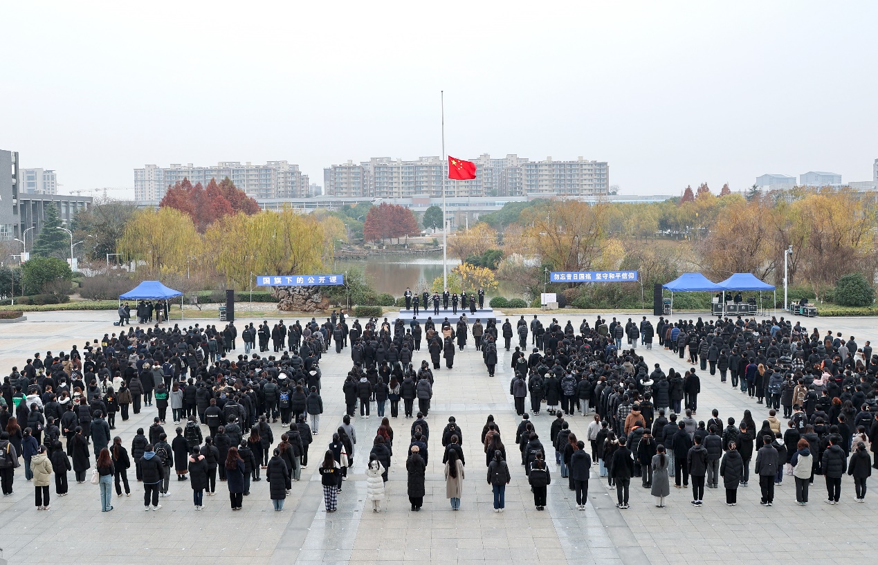 12月13日,由校团委主办、理学院承办的“国旗下的公开课”第三十三次集体课程——“勿忘昔日国殇,坚守和平信仰”南京大屠杀死难者国家公祭日悼念活动在江宁校区1936广场举行。校党委副书记、纪委书记戴建君,校党委副书记、副校长王正华,副校长袁浩,副校长杨勇出席活动,相关职能部门负责人,各学院领导、师生代表近千人参加活动。活动由理学院党委书记周新虎主持。