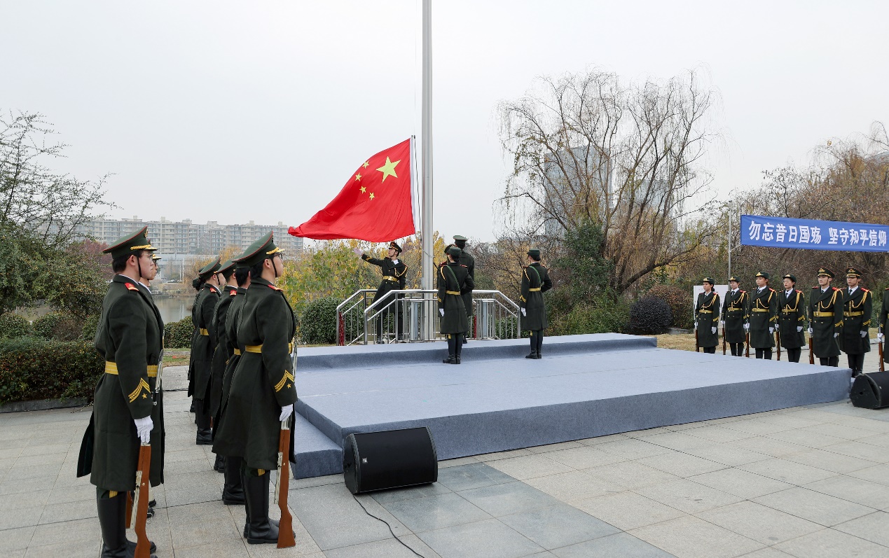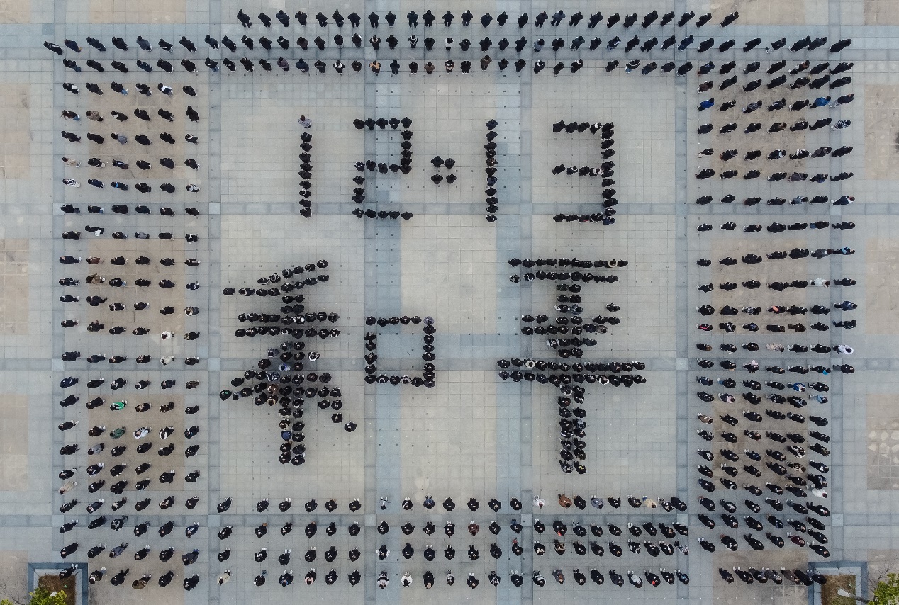 上午9时55分,校国旗护卫队迈着整齐的步伐护送国旗入场,在全体师生的注目礼中,五星红旗冉冉升起。国旗升至顶端之后,停留数秒,再缓缓下降到距离顶端三分之一处。伴随着防空警报响起,全场为南京大屠杀死难者默哀。广场上,全体师生身着素装、佩戴白花,在广场庄重肃穆摆出“12·13”及“和平”字样。