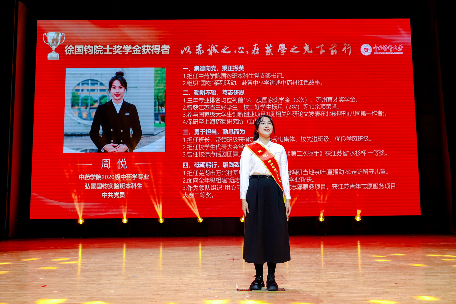 “在大一的一次讲座上,我学习到了徐国钧院士的感人事迹,当时我深深震撼于他破解马王堆汉墓中药密码的智慧,钦佩于他开创粉末鉴定和中成药显微鉴定技术的毅力。今后,我要向他学习,朝自己的梦想努力!”徐国钧院士奖学金获得者周悦说。