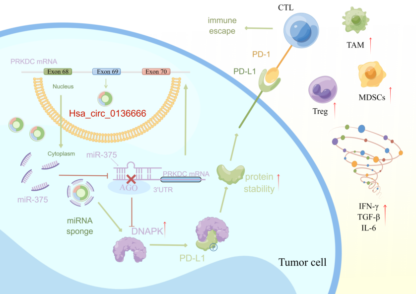 环状RNA(circRNAs)是真核生物中共价封闭的内源性生物分子,属于非编码RNA。越来越多的研究表明环状RNA在癌症的致病机理中可能发挥生理作用,包括在癌症转移、预后等进程,相关机制尚不明确。该项研究报道了在胃癌中高表达的环状RNA hsa_circ_0136666具有促进胃癌增殖和肿瘤免疫逃逸的功能,通过hsa_circ_0136666/miR-375/PRKDC信号轴调控蛋白激酶DNAPK对PD-L1的磷酸化,抑制PD-L1蛋白降解,导致PD-L1的异常积累,引发免疫逃逸。利用纳米脂质颗粒(LNPs)包裹靶向hsa_circ_0136666的siRNA,能够显著抑制肿瘤免疫抑制细胞MDSCs与Treg细胞的招募,有效提高抗PD-L1治疗的效果。该研究为寻找胃癌治疗和预后新靶提供了理论基础,为开发胃癌治疗的小RNA药物提供新的思路。