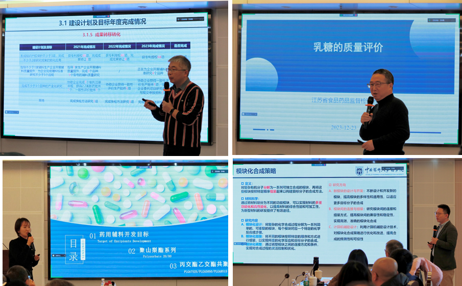 随后,孙春萌教授作重点实验室工作报告,详细介绍了重点实验室2023年建设情况及三年期建设目标完成情况;江苏省食品药品检验监督研究院检验技术研究室主任袁耀佐、南京威尔药业集团研究院(江苏省水溶性药用辅料工程技术研究中心)副院长王娅、beat365官方网站药剂系副教授何东升分别就各单位研究进展进行主题报告。
